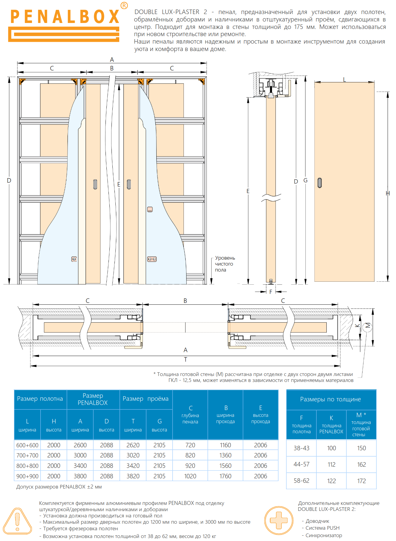 Пенал, предназначенный для установки двух полотен, сдвигающихся в центр, обрамлённых доборами и наличниками в оштукатуренный проём. Подходит для монтажа в стены толщиной до 150 мм. Может использоваться при новом строительстве или ремонте.
