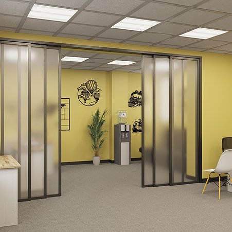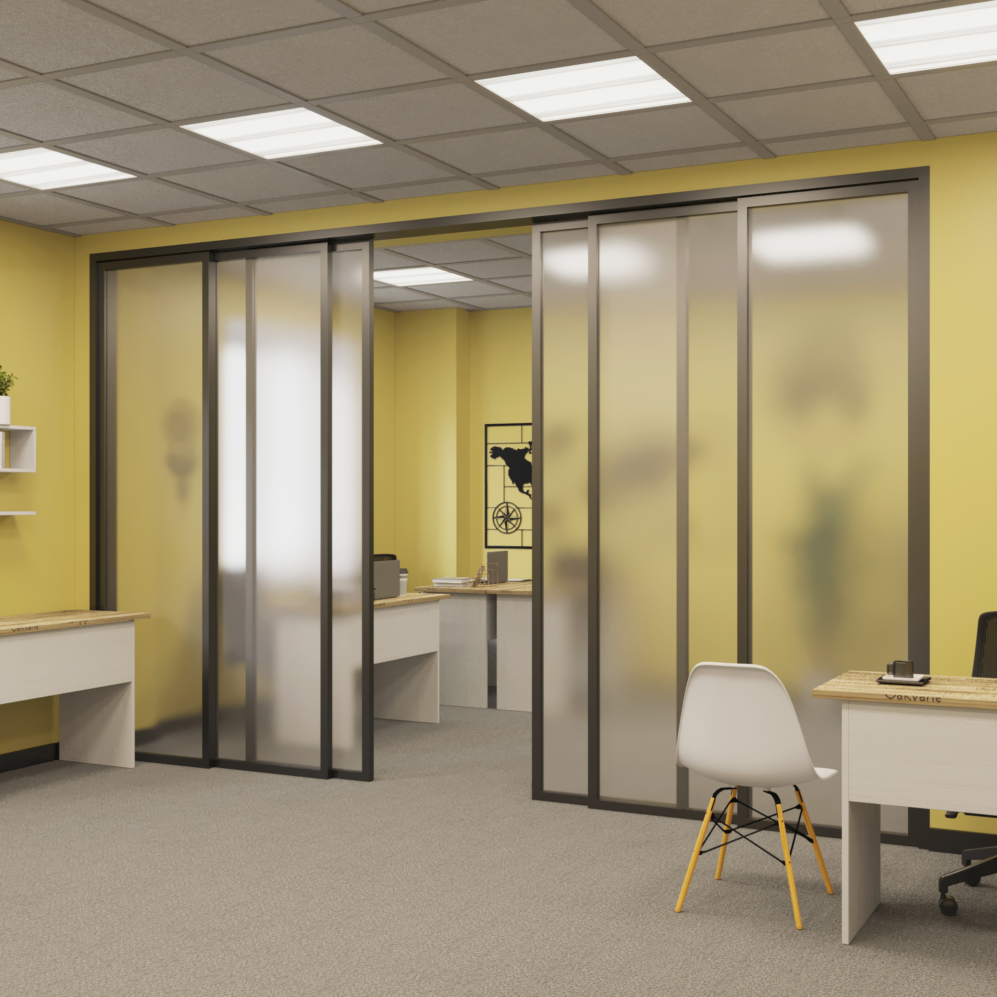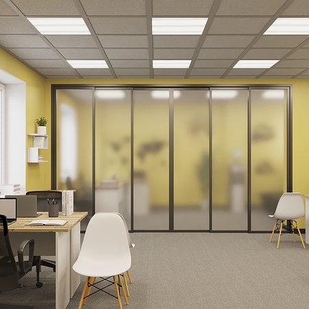 Четыре полотна подвижных, два зафиксировано, сдвигаются в центр.